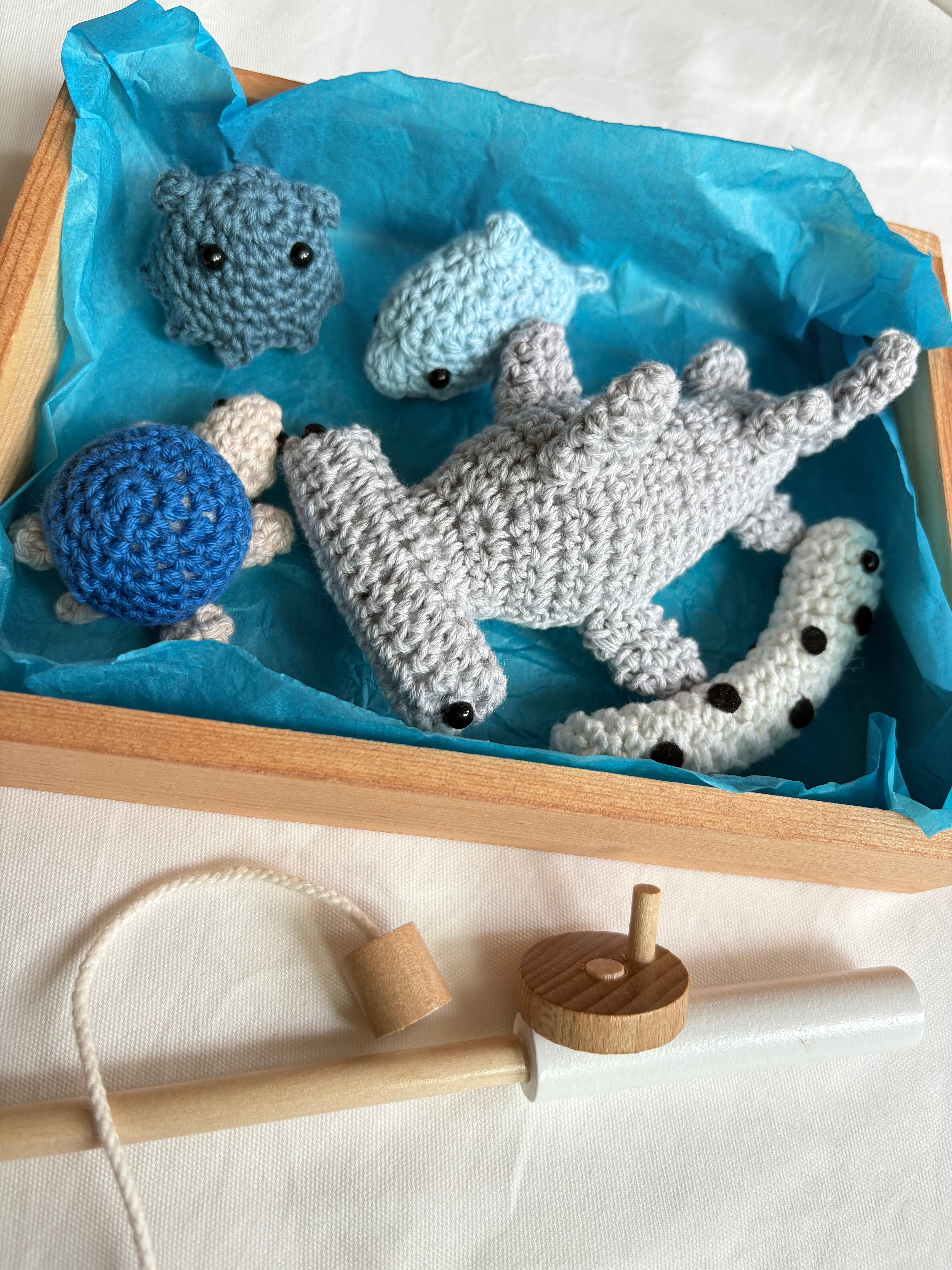 ジンベイザメ、カメ、イルカ、ニシキアナゴ、メンダコの5種類の魚釣りセットです。